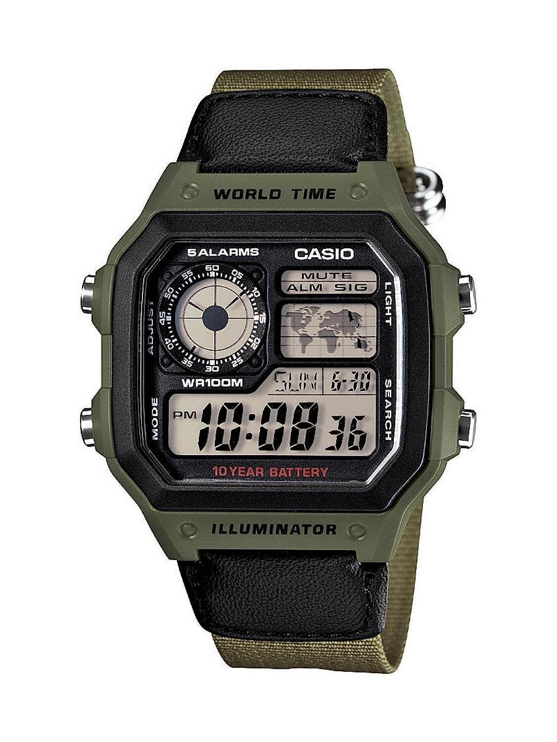 The Casio AE‑1200WHB‑3BV is a rugged digital watch designed for travel and daily wear. Featuring world-time functionality, long battery life, and 100 m water resistance, this watch keeps you on schedule wherever you go. Its green cloth strap and durable resin case make it comfortable, practical, and stylish.