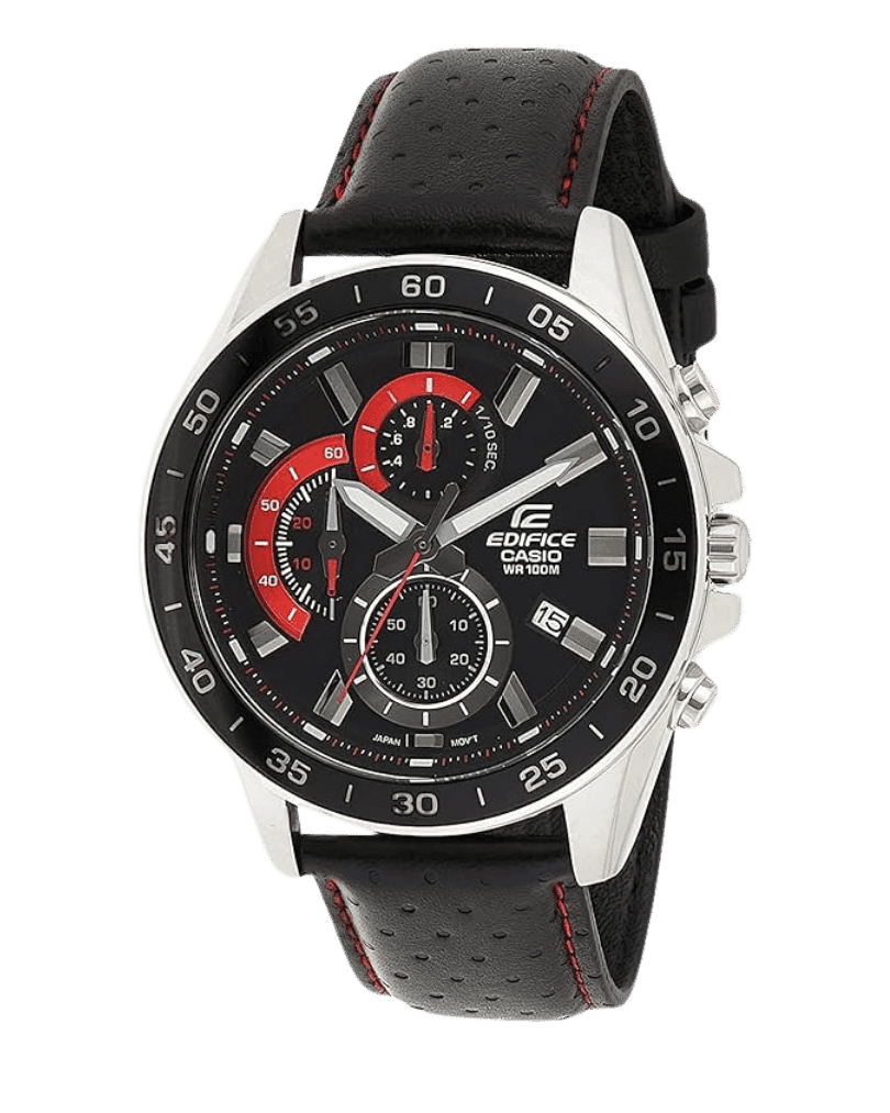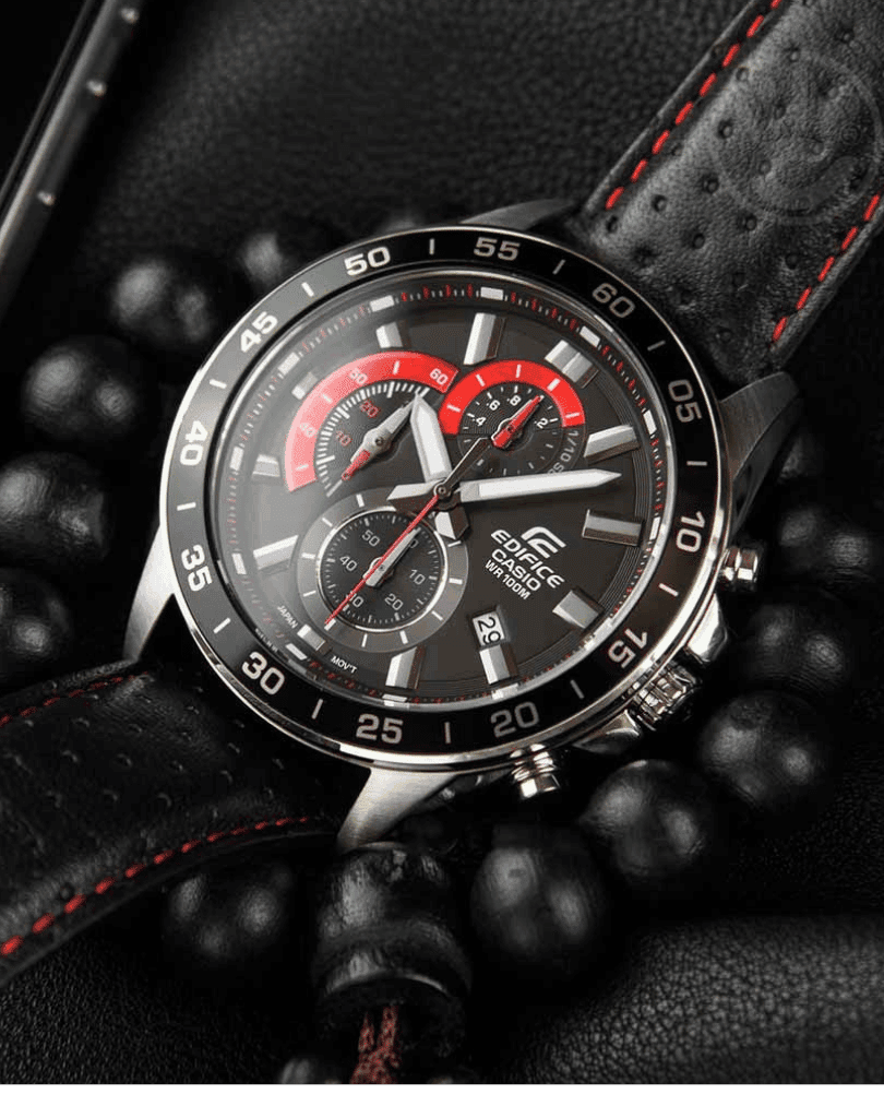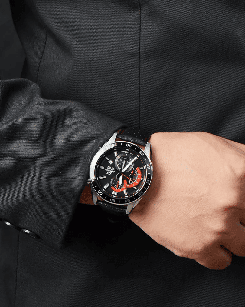 The Casio Edifice EFV-550L-1AVUDF perfectly fuses sporty design and precision engineering. Crafted for the modern man who values style, durability, and functionality, this watch features a robust stainless steel case paired with a genuine leather band, making it suitable for both professional and casual settings. Its chronograph functionality, clear sub-dials, and sleek black dial offer superior readability and time-tracking performance.