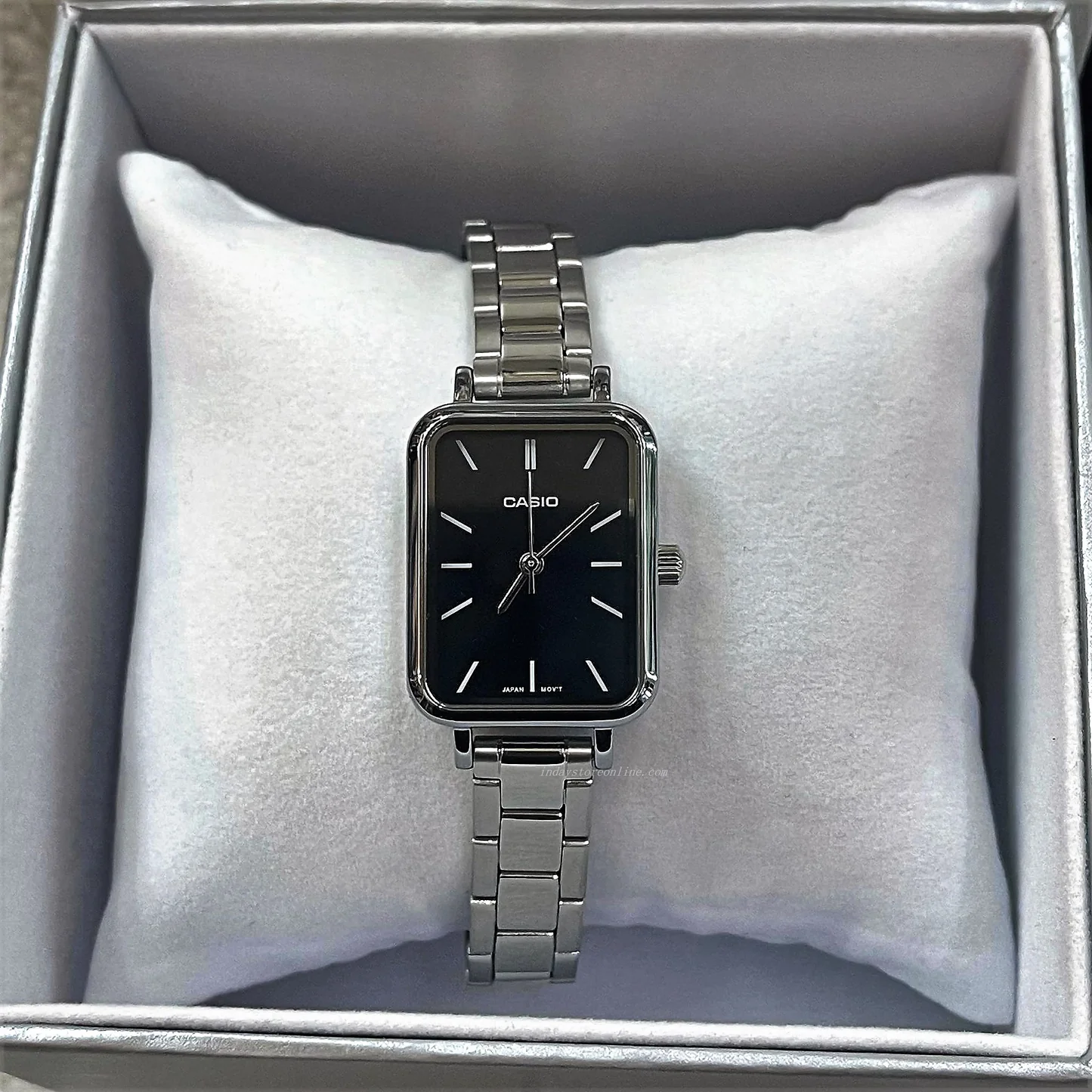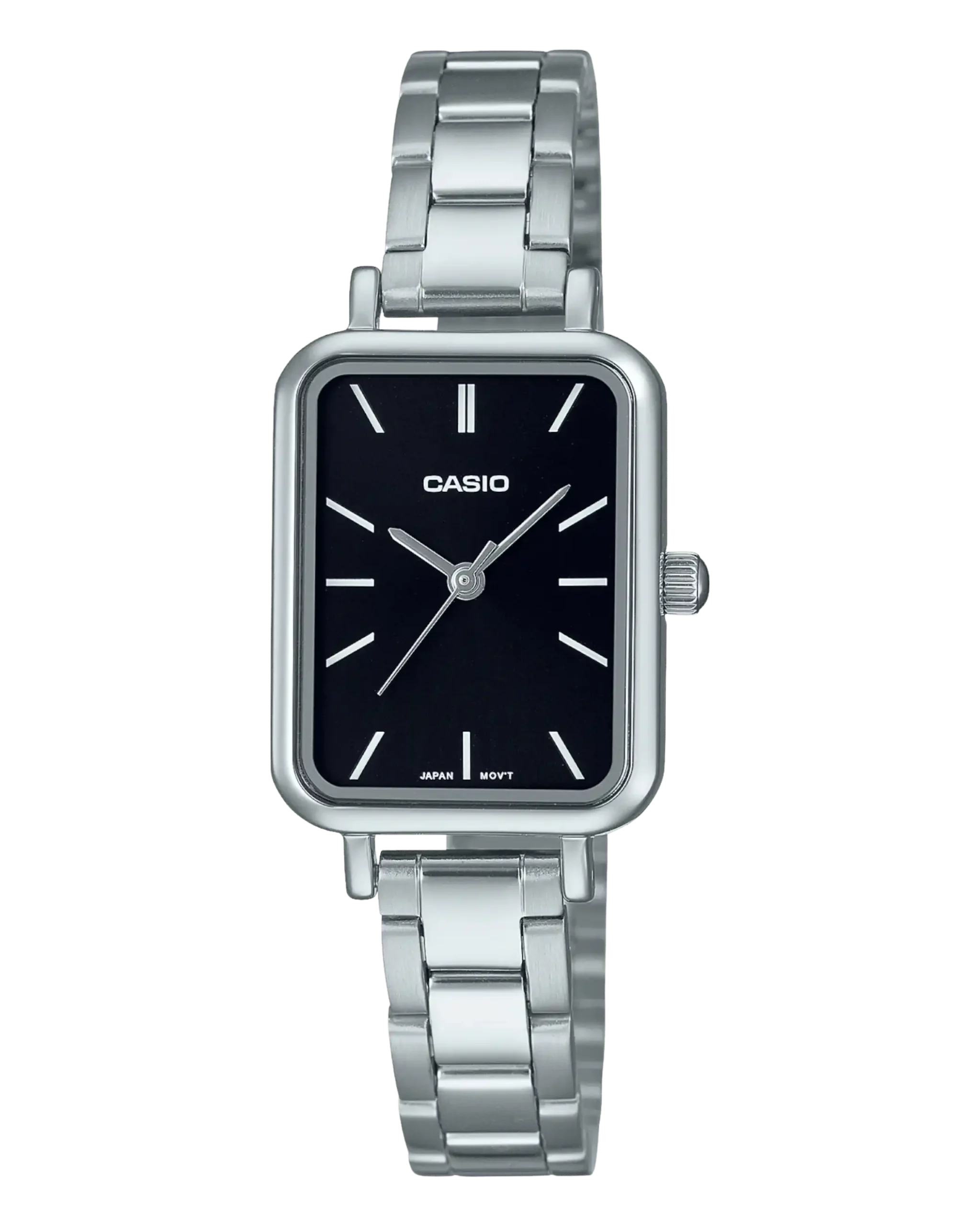 The Casio LTP-V009D-1EVDF offers a perfect balance of classic and contemporary design. Its sleek black dial contrasts beautifully with the polished silver stainless steel case and band, creating a versatile watch suitable for both casual and formal occasions.