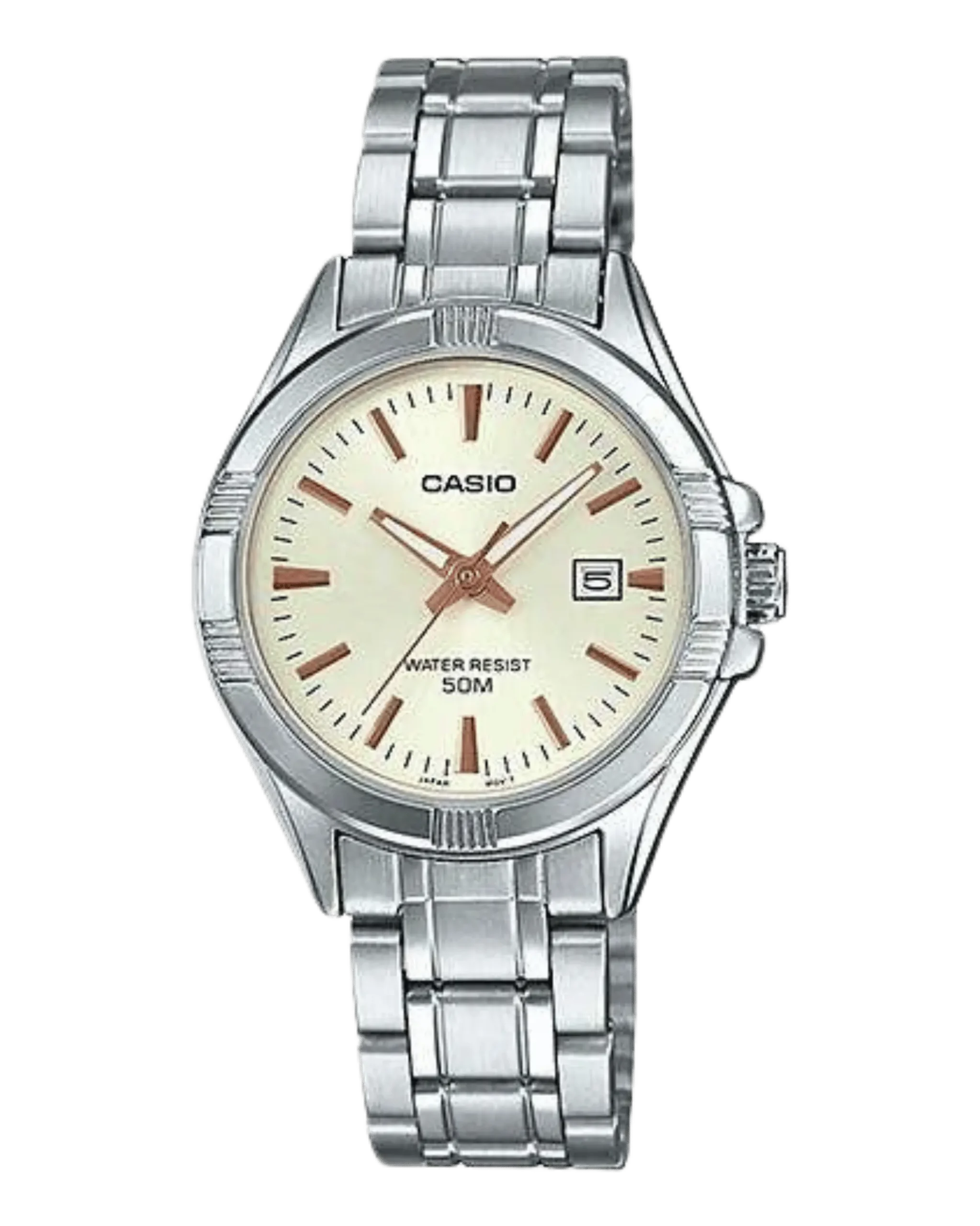 Powered by a precision quartz movement, this timepiece delivers reliable and accurate timekeeping, complemented by a date display at the 3 o’clock position. The stainless steel bracelet provides both strength and comfort, while the mineral glass crystal shields the dial from scratches and daily wear.Close-up of gold dial and date display on Casio watch