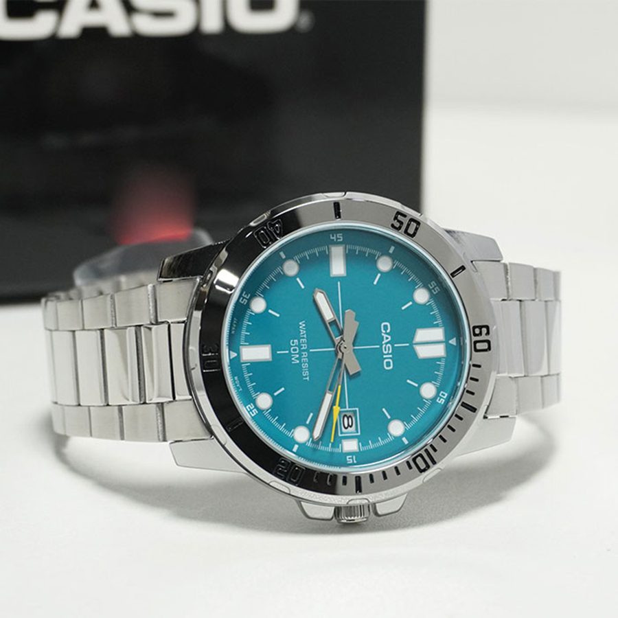 The Casio MTP-VD01D-3E2VDF is a modern men’s watch designed for those who prefer a bold, sporty look with a trendy green dial. Featuring a large case, stainless steel bracelet, and clean analog display, this model offers a strong wrist presence while maintaining everyday practicality.
