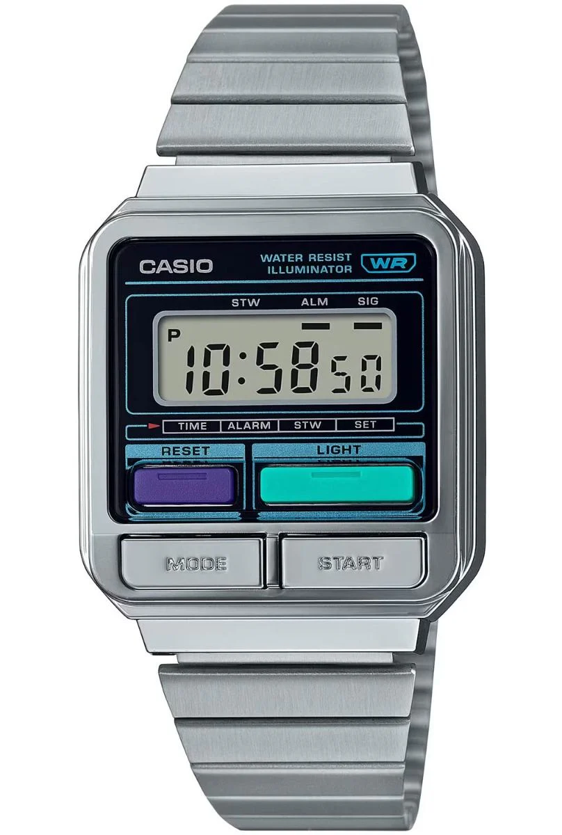 The Casio Vintage A120WE-1A brings back the bold digital style inspired by classic 1980s designs. With its distinctive front-button layout and vintage-inspired face, this watch delivers nostalgic charm combined with modern reliability. Its silver stainless steel finish makes it a standout accessory for everyday wear.
