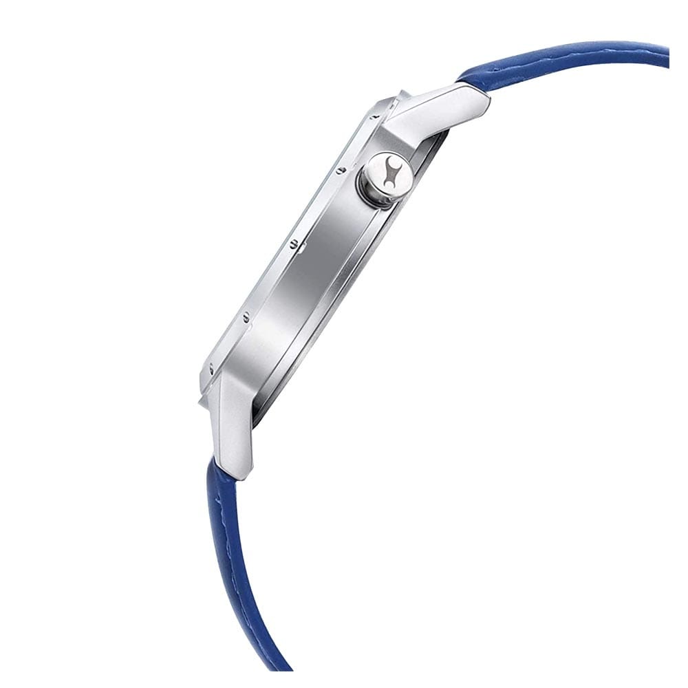 Showcasing a contemporary style, this women’s analog watch from the Space collection by Fastrack is a must-have timepiece. Inspired by the eclipse, the silver round dial is secured by a mineral glass. It displays plain three hands, star motifs, a date display window and a crown for time adjustment. The genuine leather strap comes in a blue hue that further elevates the look of the women’s watch.